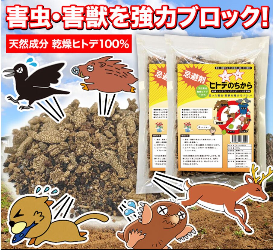 「ヒトデのちから」は、撒くだけで害虫や害獣をシャットアウトしてくれます。